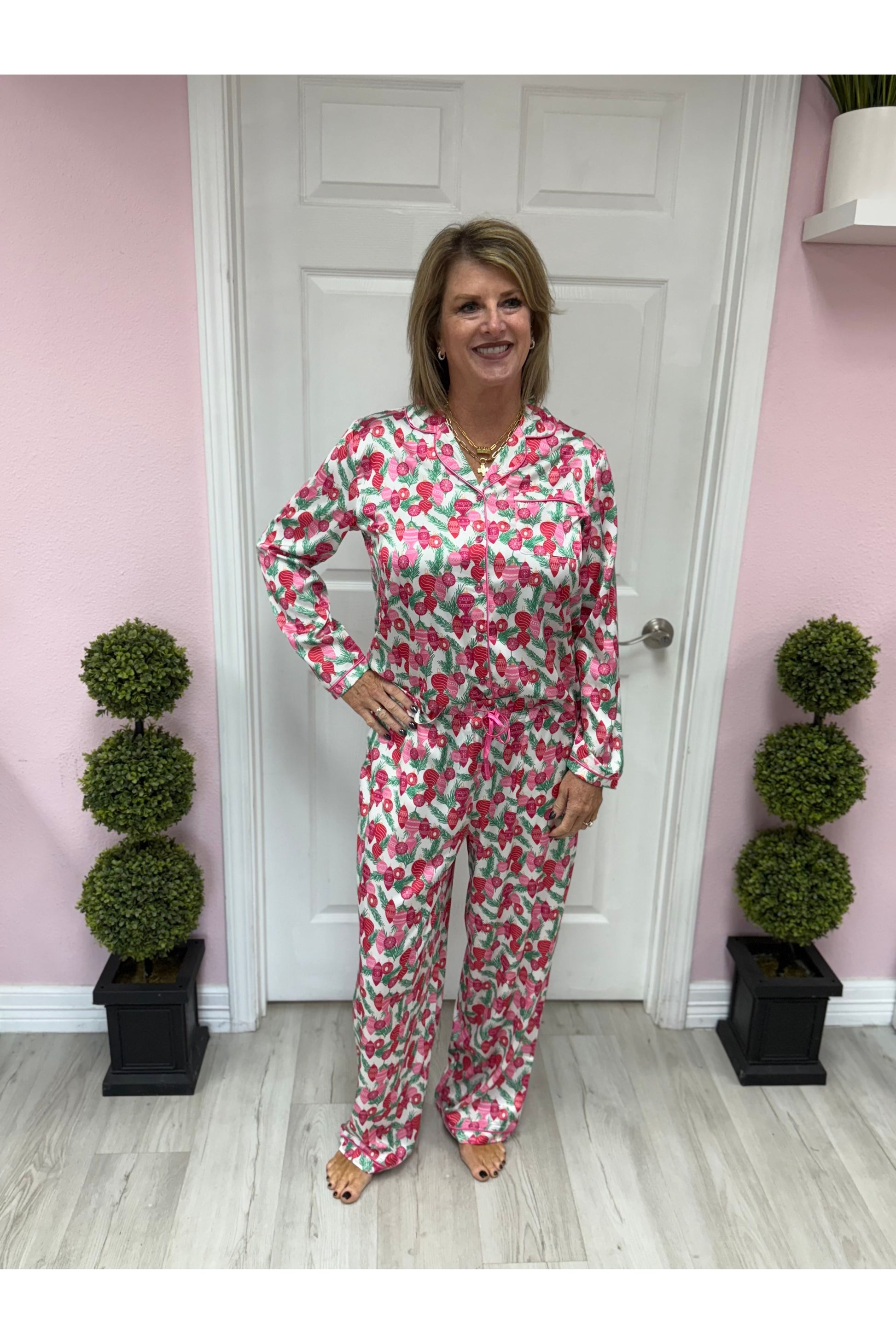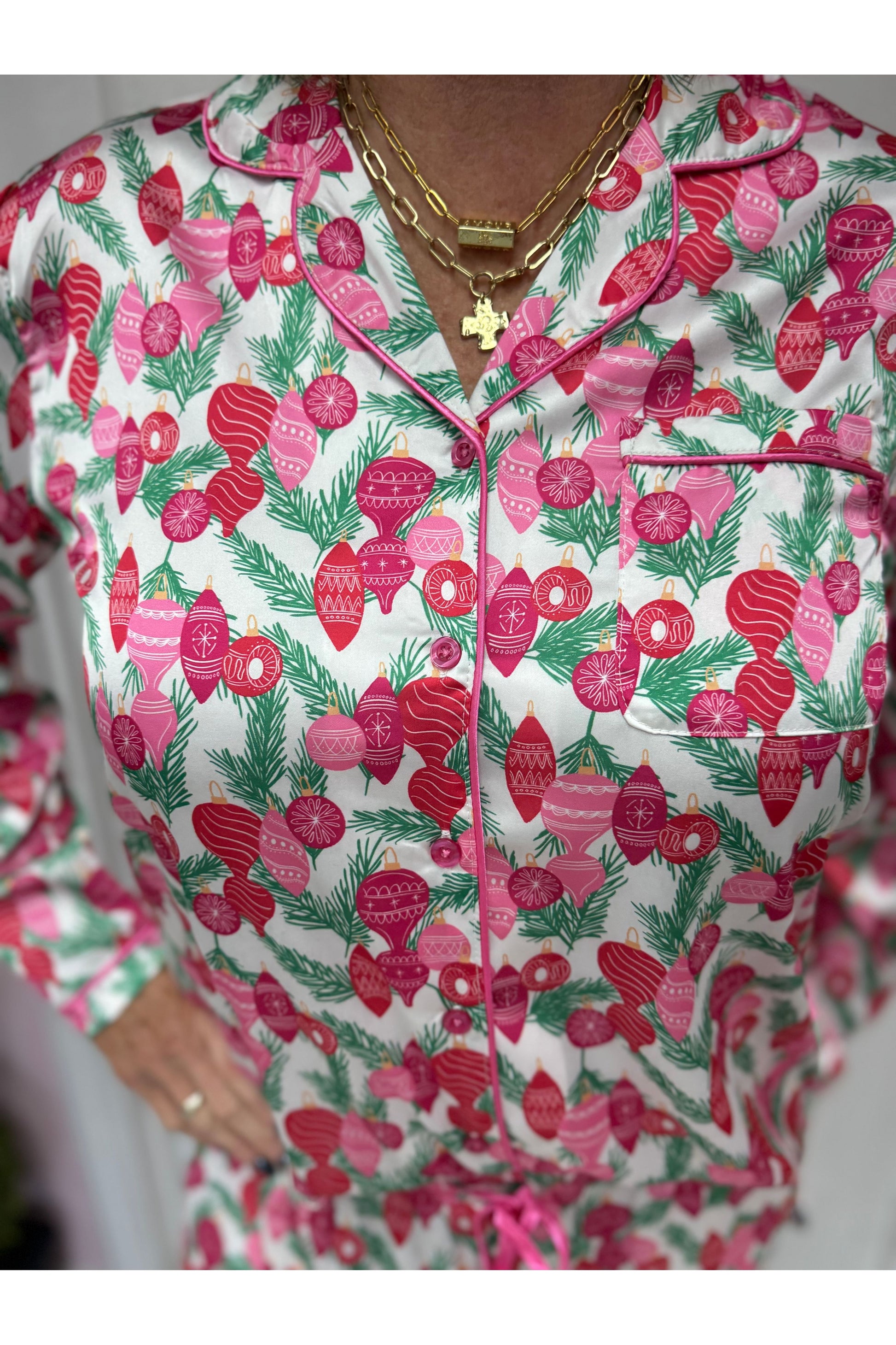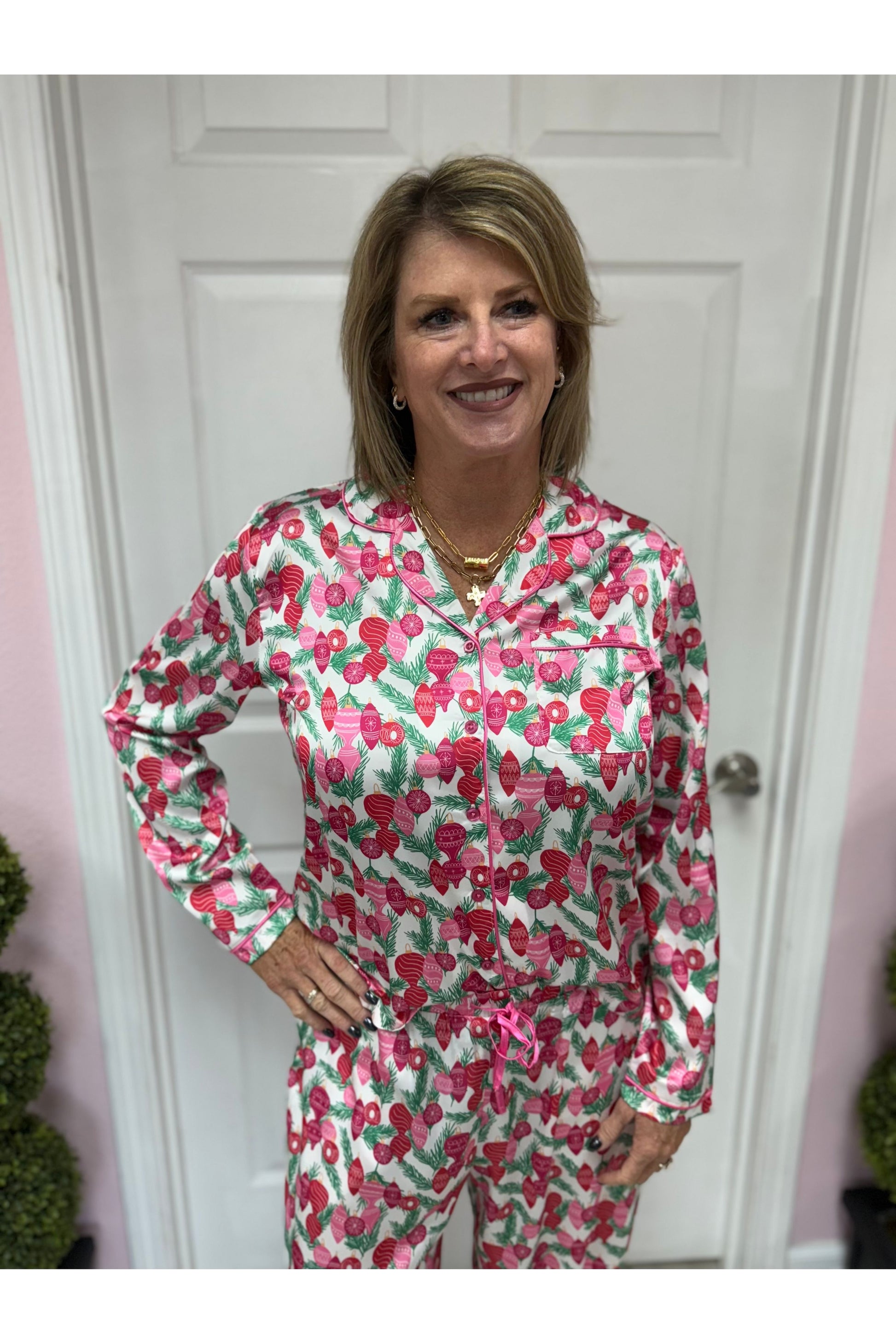 Introducing our Holiday Charlotte Pajama Set, where comfort meets festive charm. Perfect for sipping cocoa by the tree or enjoying Christmas morning in cozy style, this pajama set brings holiday cheer to every moment. Featuring a long-sleeve button-front top with a classic collar and straight-leg pants with an adjustable drawstring, our Charlotte Pajama Set combines classic holiday style with all-day comfort. Made from our signature LuxBlend fabric, this set delivers a truly luxurious and comfortable wearing experience. Its effortless drape creates a flattering, elegant silhouette while providing optimal breathability for all-night comfort.