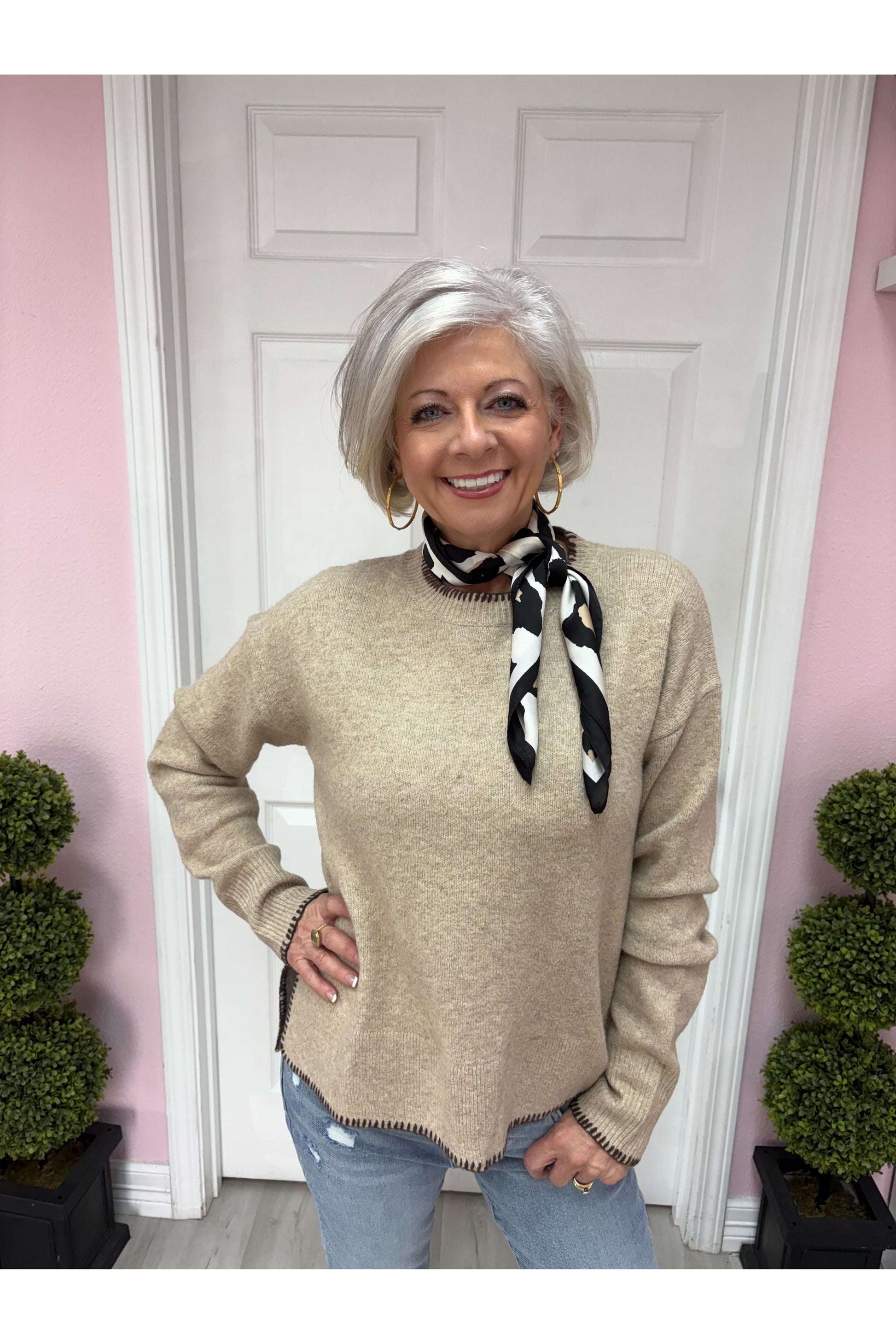 Description: Cozy up in this soft, stretchy sweater crafted with multicolor gradient yarn for a rich marled effect. Designed with a ribbed blanket stitch edge crew neck, cuffs, and high-low hem, it adds texture and charm. The side slits and relaxed fit offer comfort and movement, making it a perfect warm layer for cooler days.