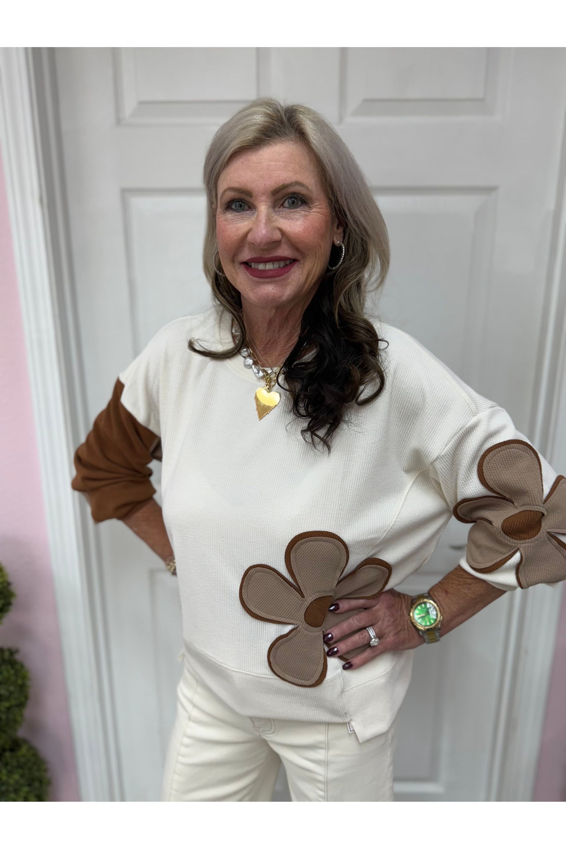 Elevate your casual wardrobe with this textured flower patchwork top. Featuring a playful mix of large floral appliques, the soft ribbed fabric adds dimension and comfort, while the uneven hem creates a modern, chic silhouette. This top brings a touch of whimsical charm to any outfit.