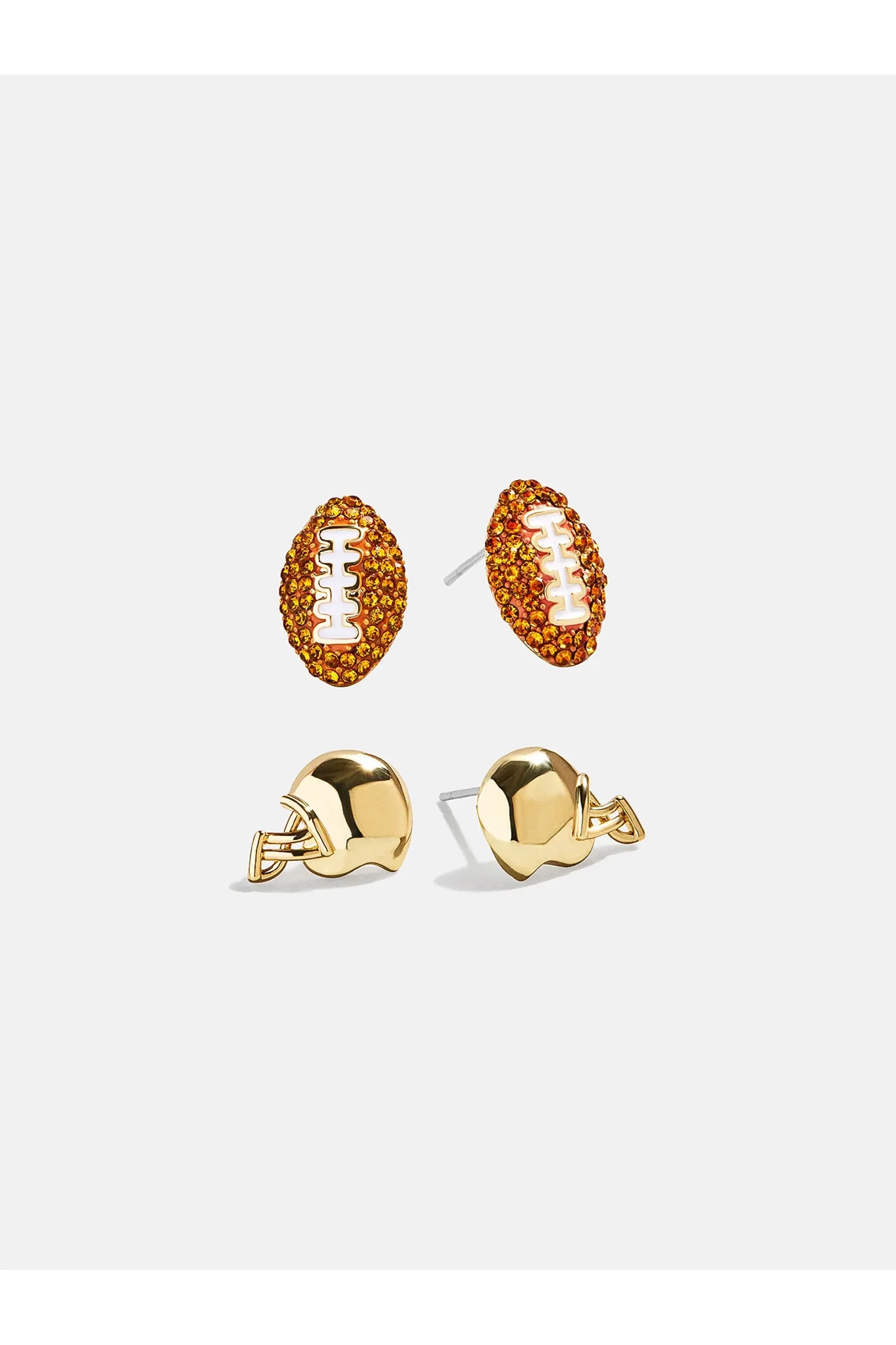 Kick off a new ear stack with studs that always score a touchdown. Introducing the Draft Pick Earring Set, football and helmet stud earrings crafted with glittering glass stones. Wear these earrings to games, tailgates, and watch parties to score major style points with any crowd. Please note this only comes with two sets of earrings, the football helmets and footballs.