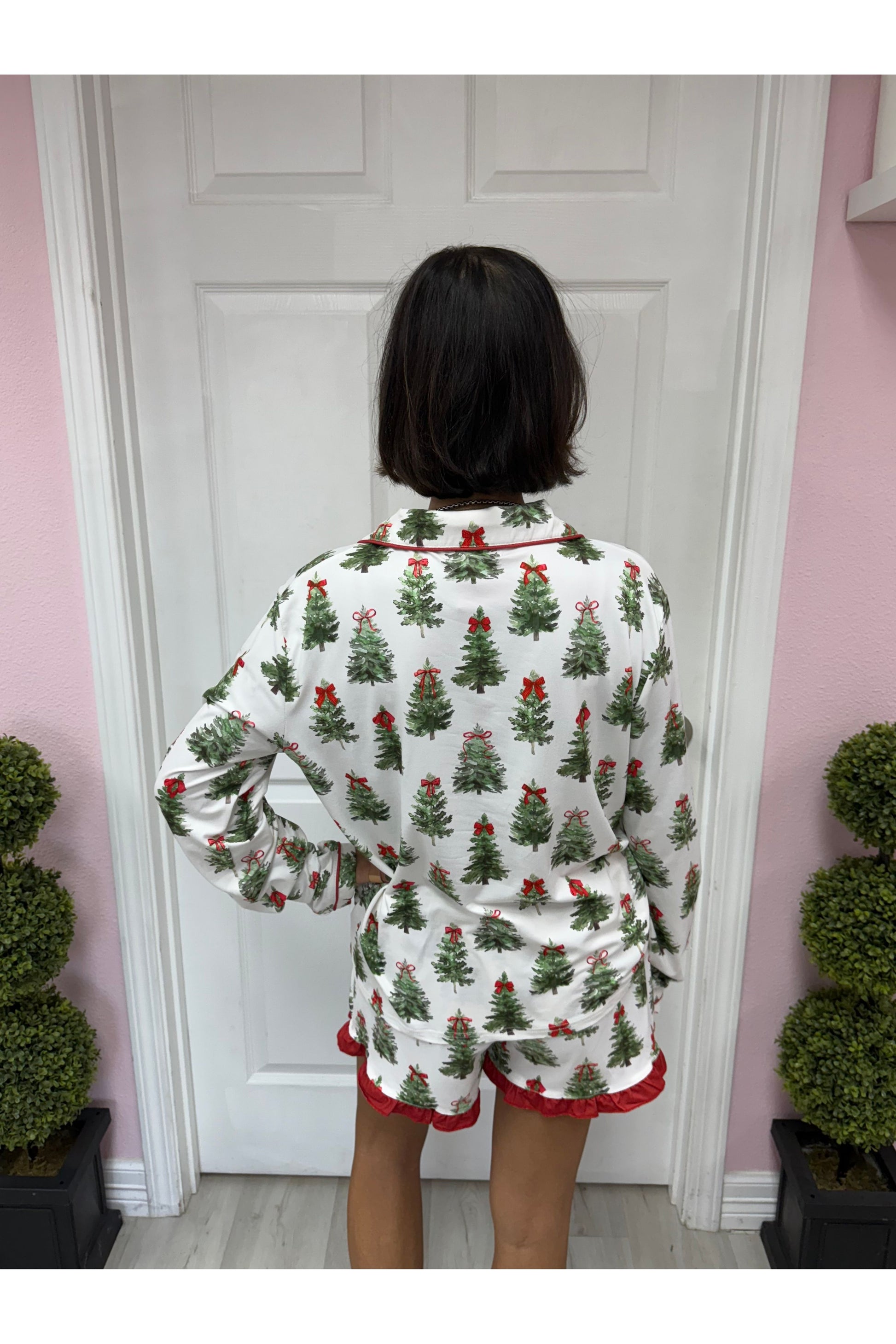 Celebrate the season in the Under the Tree Ruffle Pajama Set, featuring festive Christmas trees and bright red bows. This classic, timeless design pairs a long-sleeve top with comfy shorts for holiday cheer and cozy nights.